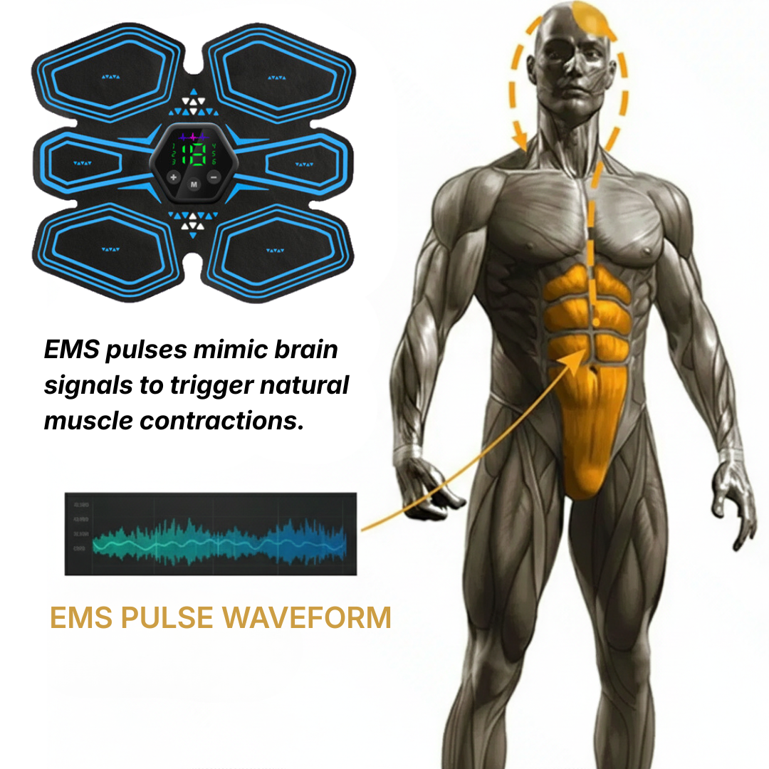 The Abs Stimulator uses EMS technology to send gentle electrical signals through the skin to targeted muscles.